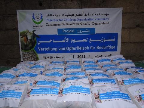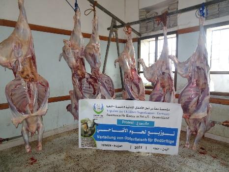 | Hilfe zur Bekämpfung von Armut und Hungersnot | Verteilung von Fleisch für bedürftige Familien im Jemen | Am Juli 2021 wurde Opferfleisch an 108 Lamm / Schafe und 129 Rind in der Republik Jemen verteilt. ca. 4560 Familien profitierten von dem Projekt, darunter Arme, Bedürftige, Waisen, Vertriebene, Obdachlose und Kranke. Die Fleischverteilung umfasste mehrere Städte im Jemen.
