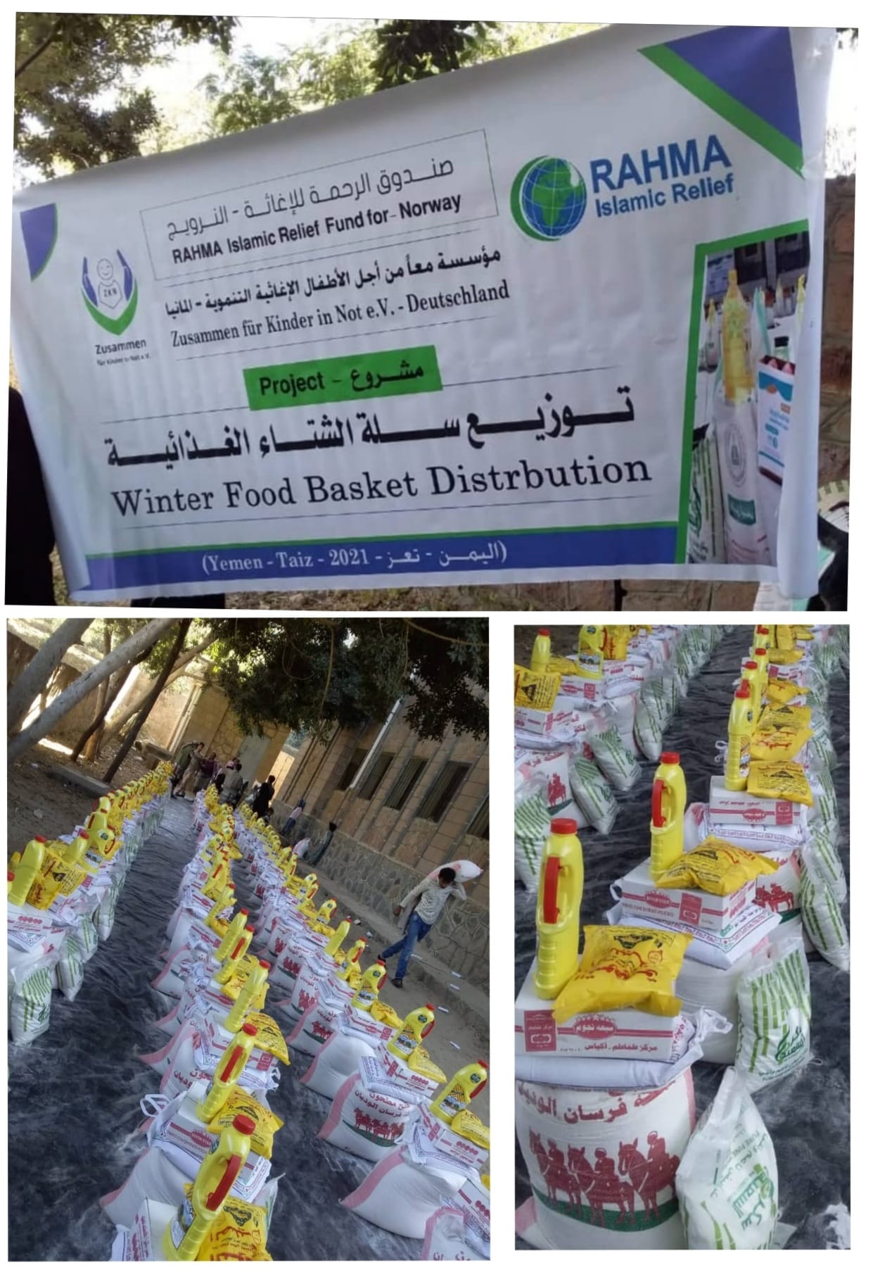 In December 2022, the Winter Aid / Winter Food Basket project was implemented in the Republic of Yemen. The project included the distribution of 300 food baskets in the Taiz governorate and surrounding rural areas. Each food basket contained 25 kg of flour, 5 kg of sugar, 5 kg of rice, 2–3 liters of oil, pasta, and beans. The project benefited 300 poor and needy families.
