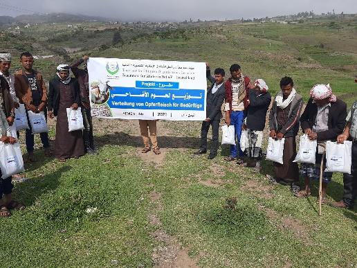 | Hilfe zur Bekämpfung von Armut und Hungersnot | Verteilung von Fleisch für bedürftige Familien im Jemen | Am Juli 2021 wurde Opferfleisch an 108 Lamm / Schafe und 129 Rind in der Republik Jemen verteilt. ca. 4560 Familien profitierten von dem Projekt, darunter Arme, Bedürftige, Waisen, Vertriebene, Obdachlose und Kranke. Die Fleischverteilung umfasste mehrere Städte im Jemen.