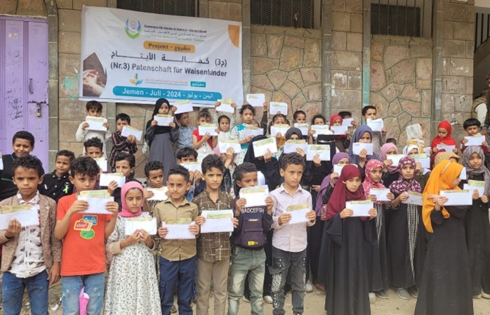 | Förderung, Schutz und Betreuung von Kindern | Patenschaften für Waisenkinder im Jemen | Im Jahr 2024 wurden im Jemen 635 Waisenkinder gefördert. Im ersten Teil wurden mit Unterstützung der Hasene International Organization 40 Waisenkinder gefördert. Im zweiten Teil Spenden von Menschen zur Patenschaft für 595 Waisenkinder. Dieses Projekt wurde in mehreren Gouvernoraten der Republik Jemen umgesetzt, darunter Sana’a, Taiz, Al-Hudaida, Ibb und Dhamar. Diese finanzielle Unterstützung für die Familien verwaister Kinder soll das Leid lindern und die Lebensgrundlagen sichern, insbesondere nach dem Verlust des Familienoberhauptes. Im Schatten von Kriegen und Konflikten steigt der Anteil der Waisenkinder und das Leben wird schwieriger. |