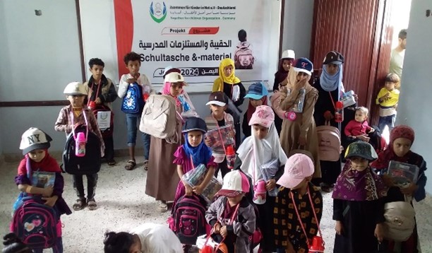 | Förderung der Bildung | Schultasche &-Materials Projekt im Jemen | Im September 2024 wurde das Schultaschen- und Materialprojekt in den Gouvernements Taiz und Ibb sowie in ländlichen Gebieten im Jemen umgesetzt. Das Projekt umfasst die Verteilung einer Schultasche mit Schulmaterial (12 Hefte, ein Päckchen Bleistifte, Kugelschreiber, ein Päckchen Buntstifte, 2 Spitzer, 2 Radiergummis, 2 Lineale, ein Zeichen- und Geometrie-Notizbuch, eine Trinkflasche, ein Capy oder Schulkleidung) für Schulkinder. Das Projekt kam 512 Waisen und bedürftigen Kindern zugute. |
